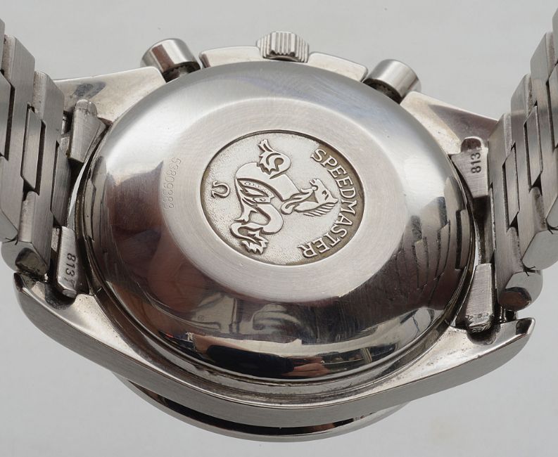 the blue dial with luminous tipped batons and hands, three subsidiary dials recording hours, minutes and continuous seconds, date aperture, tachymetre bezel, with Omega crown, stop/start function, bracelet stamped 813 & 1469