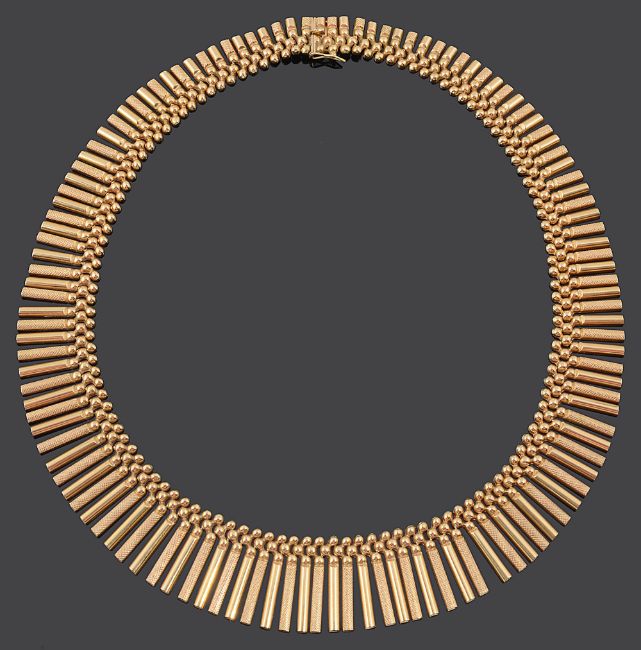 the graduated articulated fringe with alternating textured detail and woven bead inner collar, invisible push clasp fastening, stamped .750 to reverse of clasp