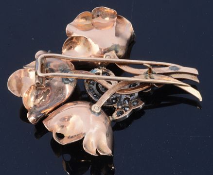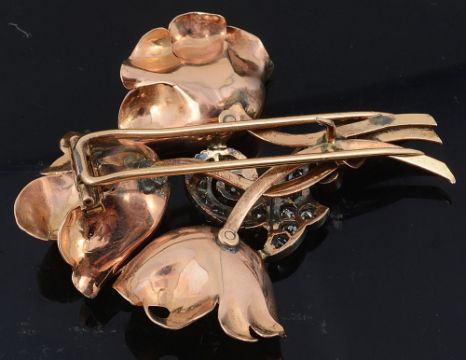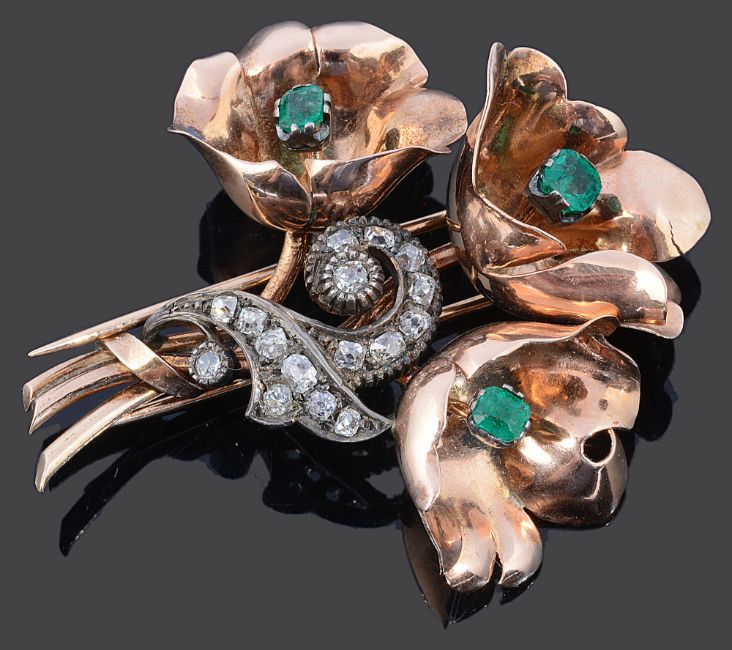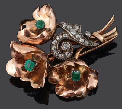 A Continental 1940's emerald and diamond floral dress clip