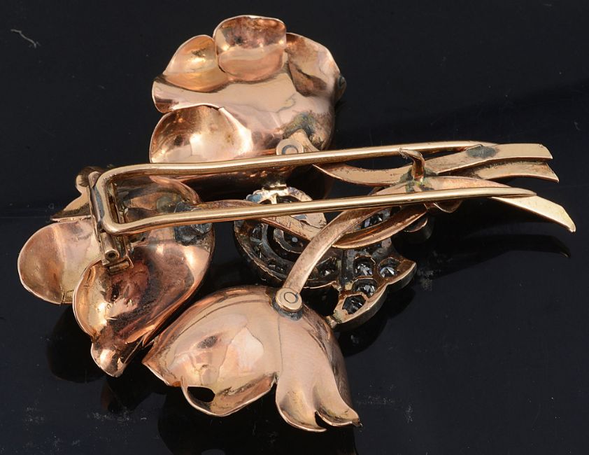 Condition: Slight crack to top most petal (please refer to photo), historic lead solder points to reverse, diamond scroll possible later addition, slight unevenness to pins