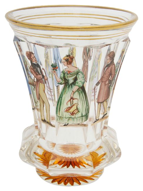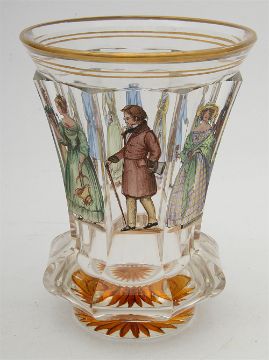 enamelled with depictions of figures in period dress, of flared form with octagonal section, gilt rim and star-etched foot,