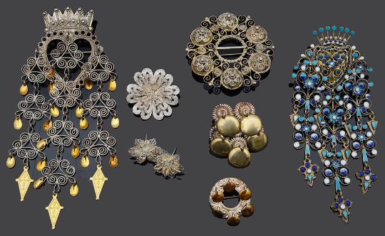possibly David Anderson, the centre shield with plique a jour enamel, another large solje filigree drop brooch, two smaller solje brooches and two filigree brooches and a pair of earrings, all test for silver (7)