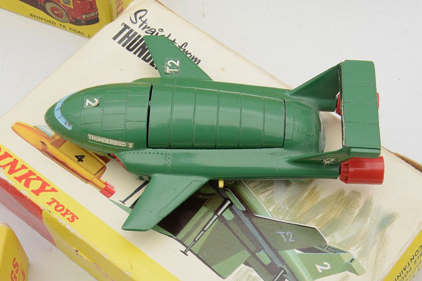 Condition: All boxes are in worn condition with ragged edges, torn and missing flaps and faded colours, Thunderbirds 2 and 4 models are in overall good condition with telescopic legs unbroken, some label edges lifted and marks to the toy body, the coal lorry in overall good condition, very slightly play worn to the wheels, the telephone box shows some rubbing and losses to the paint, the steam engine in good condition with some marks and surface dirt