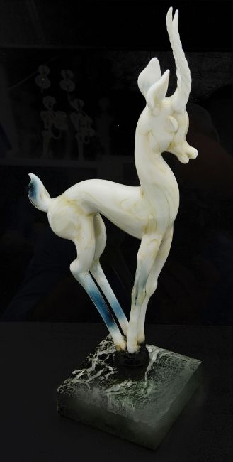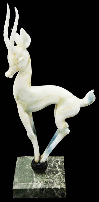 a white opalescent glass lamp work sculpture of a gazelle standing on ball, on a variegated green marble base, unsigned
