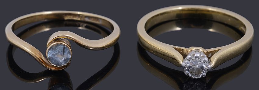 An 18ct gold single stone diamond ring and another ring,a brilliant cut diamond, claw set with tapering shoulder and a plain polished shank together with a gold single stone crossover aquamarine ring marked 18ct (2)total weight approx: 6.3g, solitaire and aqua both size: Q, Condition: Diamond ring: good condition needs cleaning.aquamarine: surface reaching inclusion