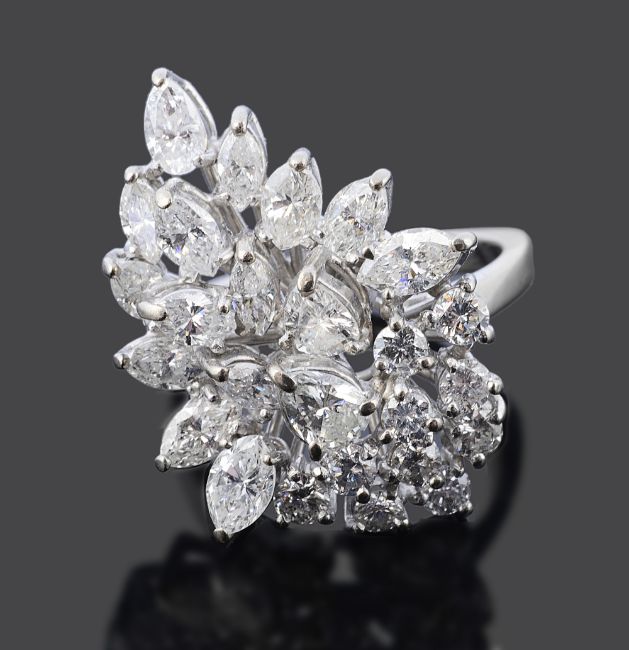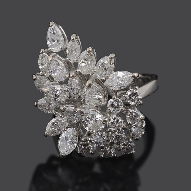 with two central pear shaped diamonds within marquis diamond set spray and having small brilliant cut diamonds to the top, 18ct white gold mount, stamped EVA