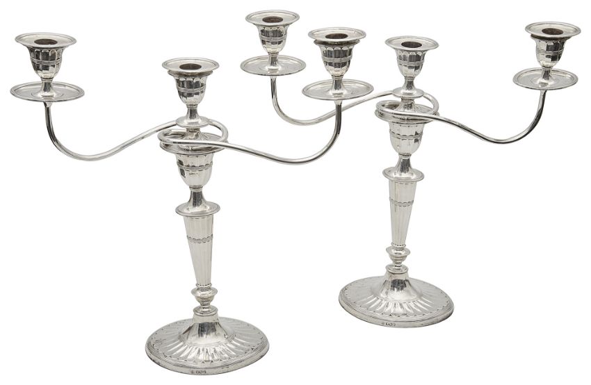 of oval fluted design with reeded borders, on tapering knopped stems issuing twin scroll branches with urn shaped nozzles fitted with detachable drip pans, on weighted bases (2)