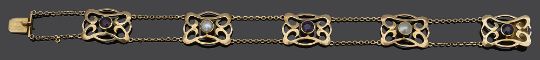 An Art Nouveau amethyst and blister pearl scroll panel bracelet
