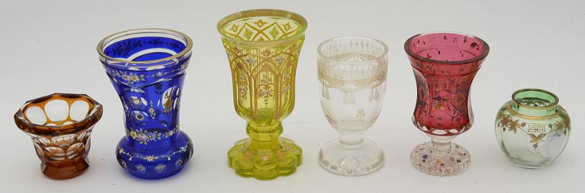 Six late 19th century Bohemian glass spa beakers and other glass,