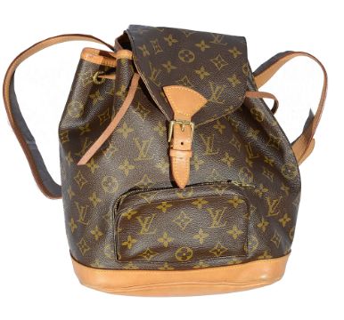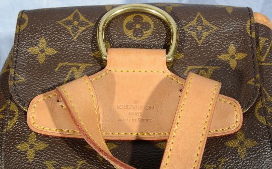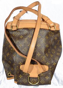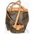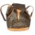 with coated monogrammed canvas, adjustable draw string, vachetta leather strap, front strap and trim, front pocket, interior pocket and gold tone hardware, numbered SP0011