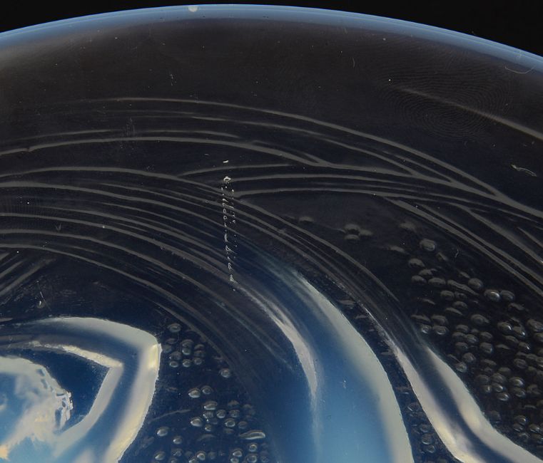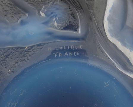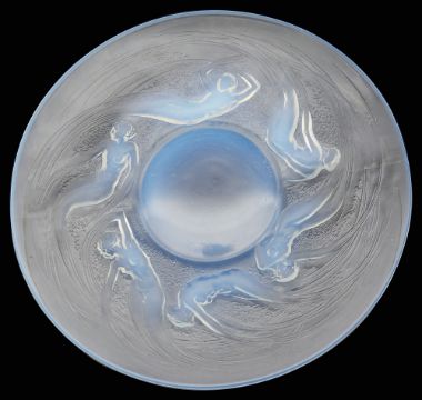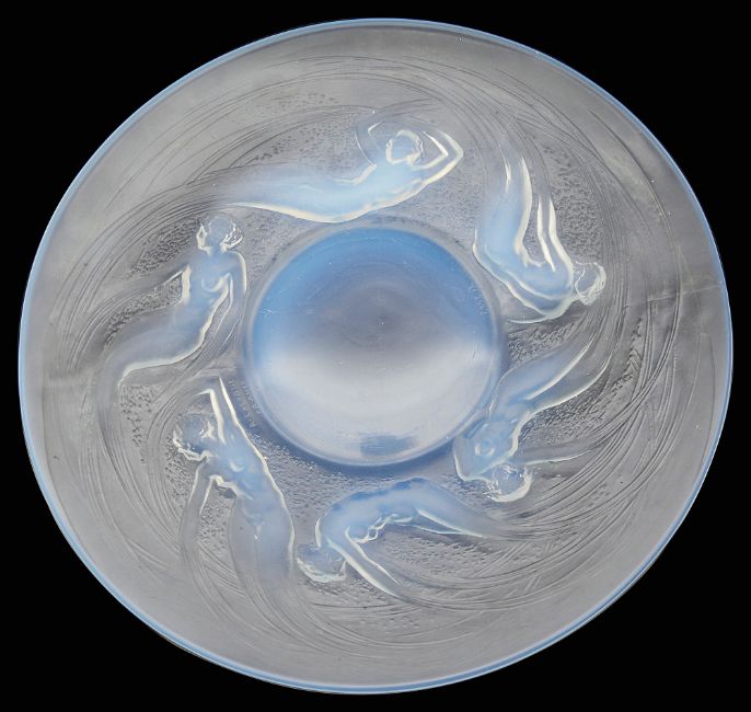 signed on the underside R.Lalique France and numbered with pattern number 380, clear frosted and opalescent glass plate with six sea nymphs swirling around the outside