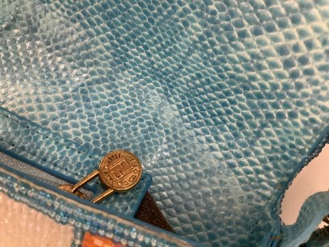 Condition: Exterior beading in very good condition as is the interior of the bag but markings and spotting to the gold tone hardware especially the buckle.