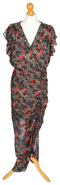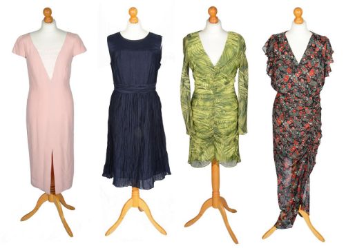 comprising a navy Tory Burch dress size 10, a pale pink Valentino dress with neck detail and front split, a Sara Bernshaw tropical print dress size UK 8 and a Veronica Beard floral print dress size 6 (4)