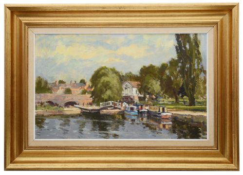 John Neale (English School, 20th Century) 'River scene with canal boats'