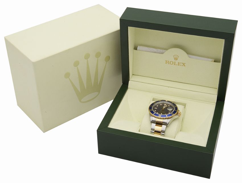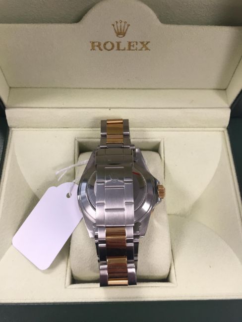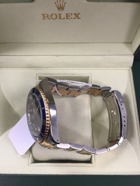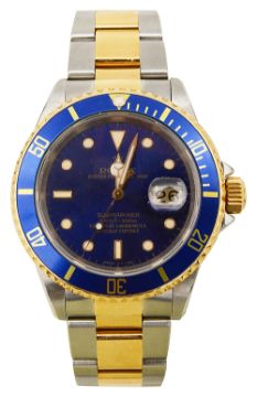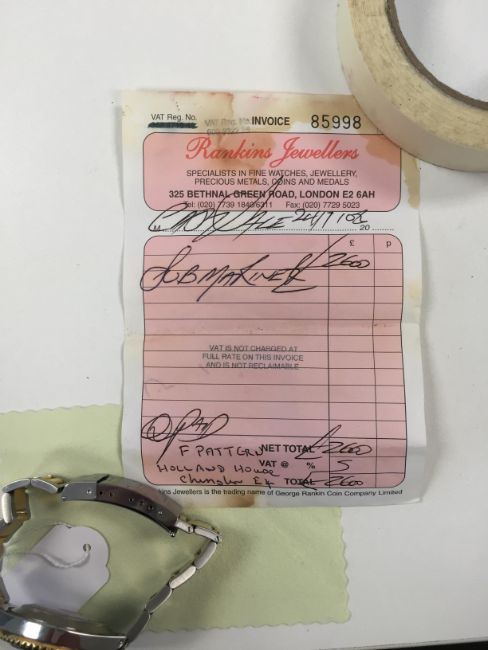 two tone dial and gold coloured bezel, luminous dot hour markers, baton quarter hands and hands, magnified datejust, with bi-metallic stainless steel and gold bracelet, with original box, receipt and outer card box