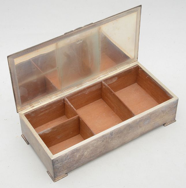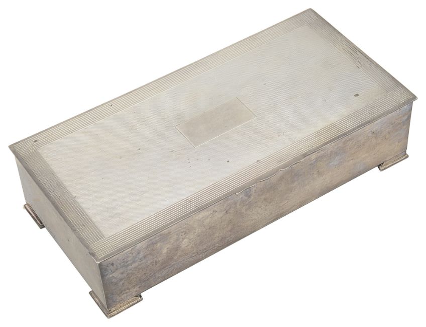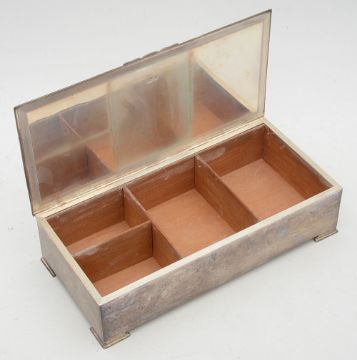 of plain rectangular form, the hinged lid with engine turned decoration and central vacant rectangular reserve, on bracket feet, the interior cedar lined with divisions