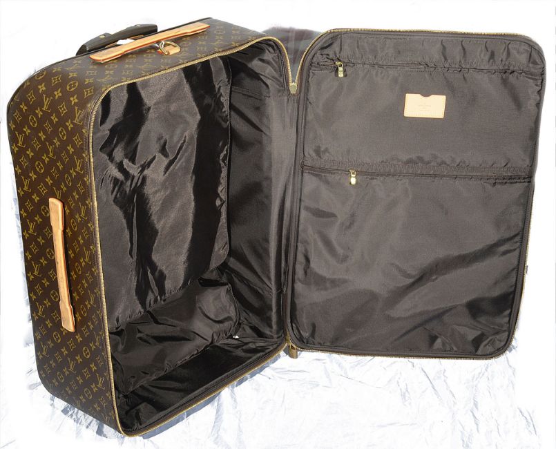 A Louis Vuitton monogrammed canvas 'Pegase Legere 65' suitcase , vachetta leather handles and detailing, gold tone hardware, with zip pocket to the outside, two zip pockets to the interior and brown covering flaps, extendable handle, padlock