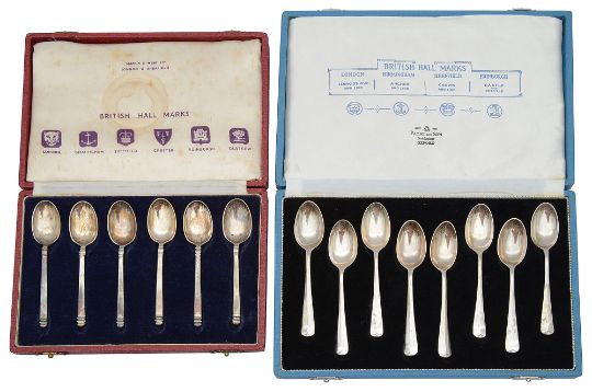Two cased sets of silver teaspoons