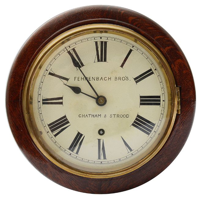 the cream enamel dial painted with black Roman numerals and minute track signed Fehrenbach Bro.'s., Chatham & Strood, 8 day German stamped W & H Sch