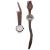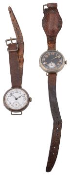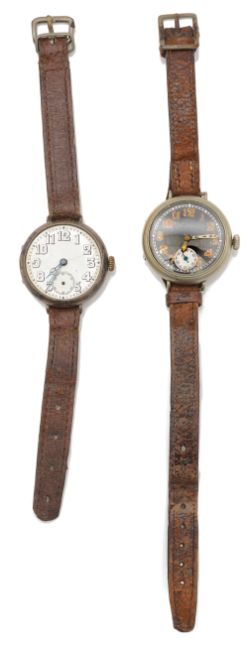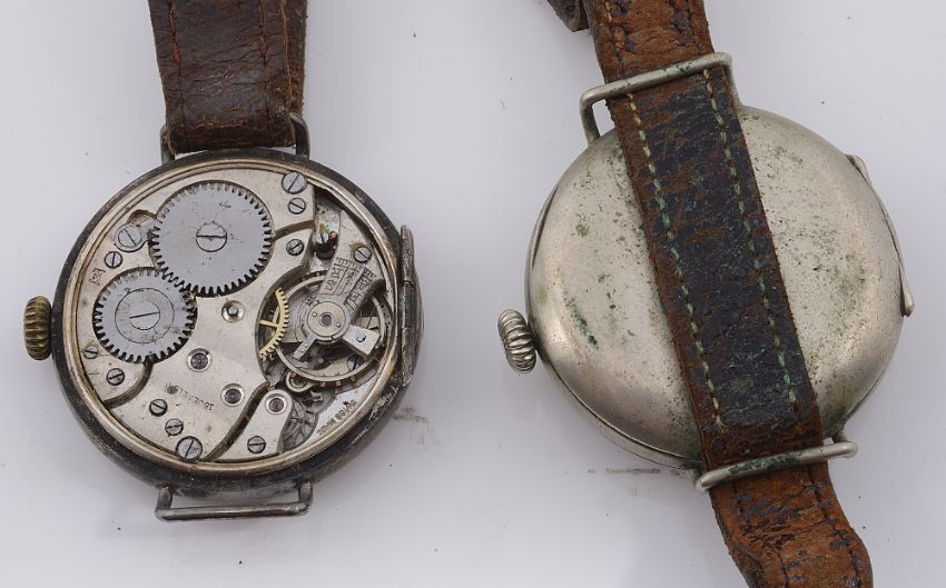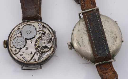 Two W.W.I Gentleman's Trench style wristwatchesfirst silver cased having white enamel dial with Arabic numerals, minute track and subsidiary seconds dial, 15 jewels movement, the case marked with London, 1915 by Arthur George Rendell, stamped T numbered 640176, on a leather, on a leather bracelet, second nickel case having black dial with luminous Arabic numerals and hands, white minute track and subsidiary seconds dial, on a leather bracelet, (2)first dial diameter 29 mm., case diameter 33 mm.Condition: First without glass and subsidiary seconds hand, hairlines to dial. Case back has sheared from hinge. Movement winds but doe snot tick or run. Second, wear to case. Some loss to luminous numerals. Watch wind ticks and runs at time of cataloguing. Wear to leather bracelet. No guarantee can e offered as to the full working order of these watches.