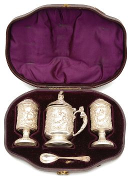 A Victorian electrotype Renaissance Revival style three piece cruet set by Elkington & Co.