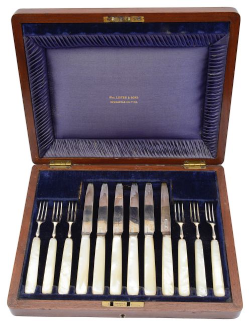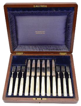 An Edward VII silver and mother of pearl handled set of fruit knives and forks in a fitted mahogany case