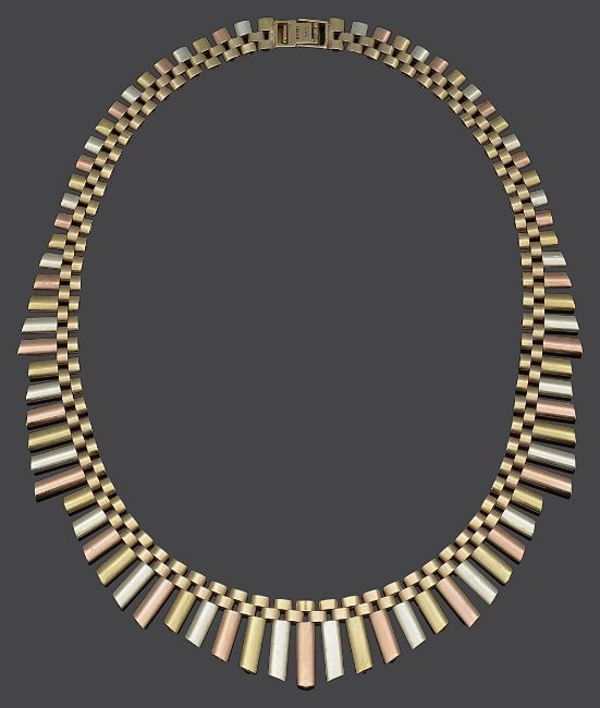 of alternating and graduated lengths, marked on the clasp 9 3.75 and makers initials L.V.L
