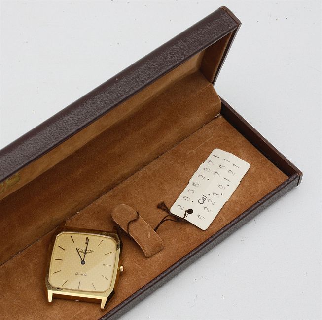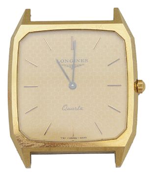 the square gold toned dial with canted corners and baton numerals, without strap