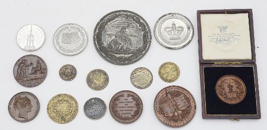 to include George III Grand National Jubilee 1809, George IV beloved lamented death medal (drilled), William IV and Queen Adelaide bronze coronation medal by Wyon, 1831, various Victoria coronation medals, Prince of Wales 1863 marriage medal in a fitted Hunt & Roskell leather case, Prince Albert death medal by Ottley, Prince Albert National Memorial by Wyon, etc., (15)