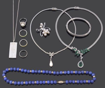 comprising a 9ct gold and lapis lazuli bead necklace, a cultured pearl and silver spray brooch, a threadwork hinged bangle, two paste set necklaces, cased, a silver ingot pendant and various rings (qty)