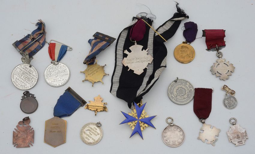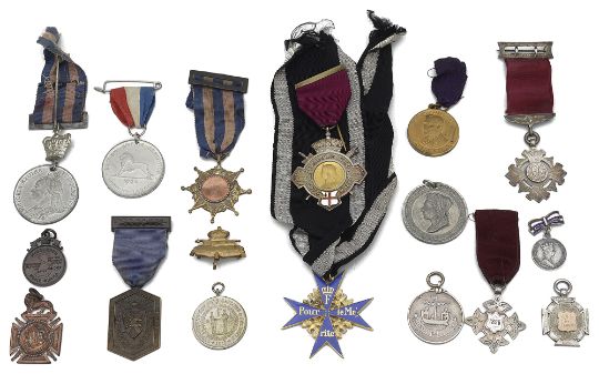 first Obverse gilt central roundel with head of Queen Victoria surrounded by legend ÒInaugurated Nov. 6 1869Ó, below which is the red and white enamelled crest of the City of London, 2 small roundels bearing views of Holborn Viaduct and Blackfriars Bridge left and right, crown above, the whole superimposed over sword and mace. Reverse engraved ÒRobert Besley Esq. Alderman Lord Mayor ElctÓ; together with a Reproduction WW1 Imperial German Pour Le Merite "Blue Max" neck badge on ribbon, various silver prize medals etc. (qty)
