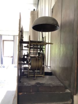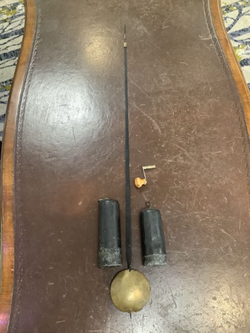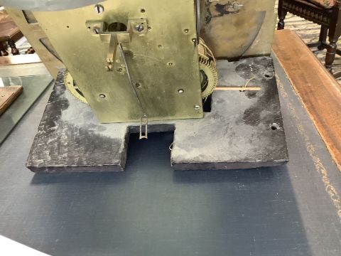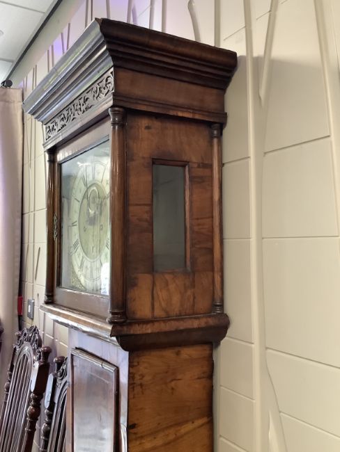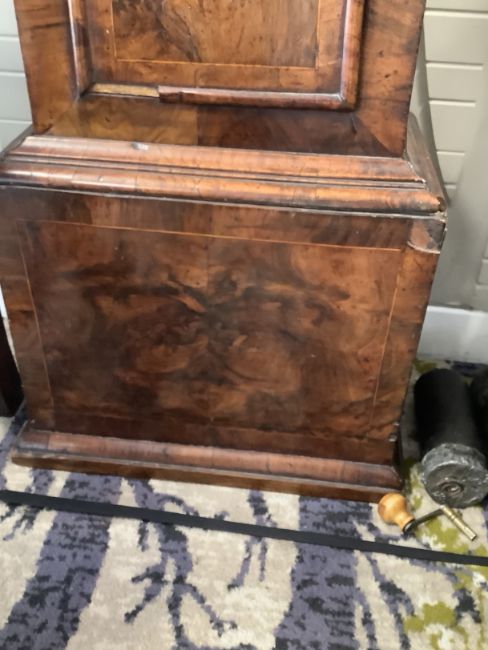 Condition: Pendulum and weights present. Slight bowing to sides. minors losses to moulding a cross banding notably to box base and corner of hood. Movement untested and no guarantee can be offered as to the full working order.