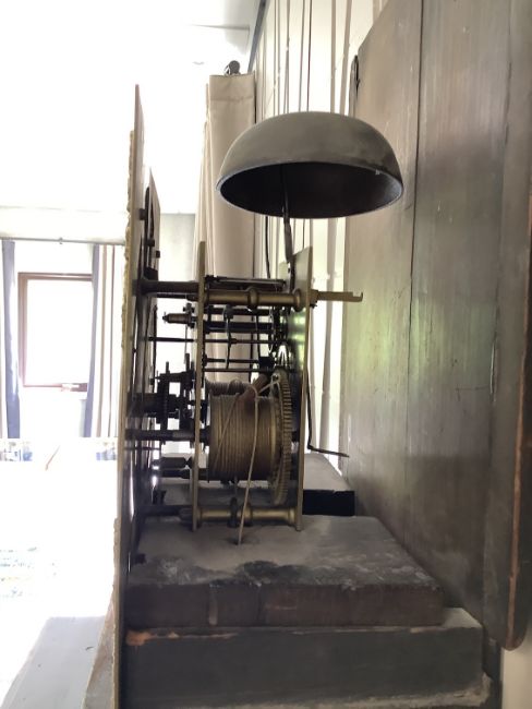 the 12" brass dial signed Benj. Martin Manchester on the silvered chapter ring, having Roman and outer Arabic numerals, dual minutes tracks, subsidiary seconds dial and calendar aperture, brass pierced mask cast spandrels, two train four pillar movement with anchor escapement striking on a bell, the crossbanded case with moulded top hood above a blind fret frieze and a glazed door flanked by a pair of plain engaged columns, the trunk with hinged door with circular glazed lenticle, on a box base on plinth