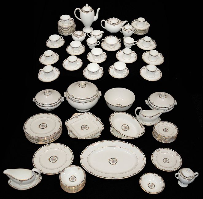 to include a platter, salad bowl, lidded soup tureen, 2 vegetable tureens, 2 square cake plates, a vegetable dish, a cream jug, a milk jug, a teapot, a coffee pot, a large lidded sugar bowl, a small lidded sugar bowl, 2 sauce boats and saucers, 12 dinner plates, 12 salad plates, 12 side plates, 12 soup cups and saucers, 12 bowls, 12 coffee cups and saucers (one saucer missing), 12 teacups and saucers, (qty)