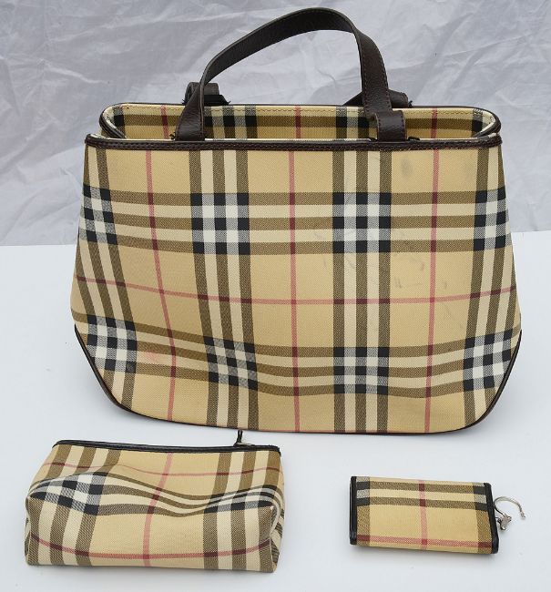 A Burberry handbag, make up bag and key wallet