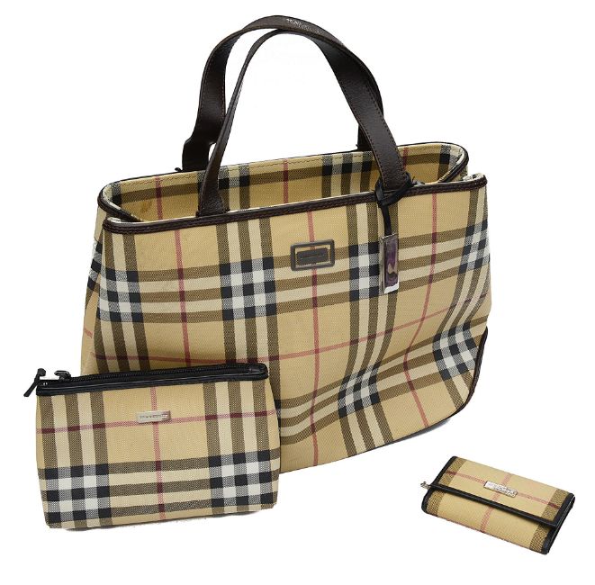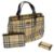 all with the classic black and red check against a beige ground, the handbag with two interior zips. (3)