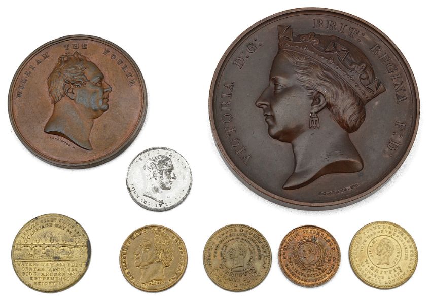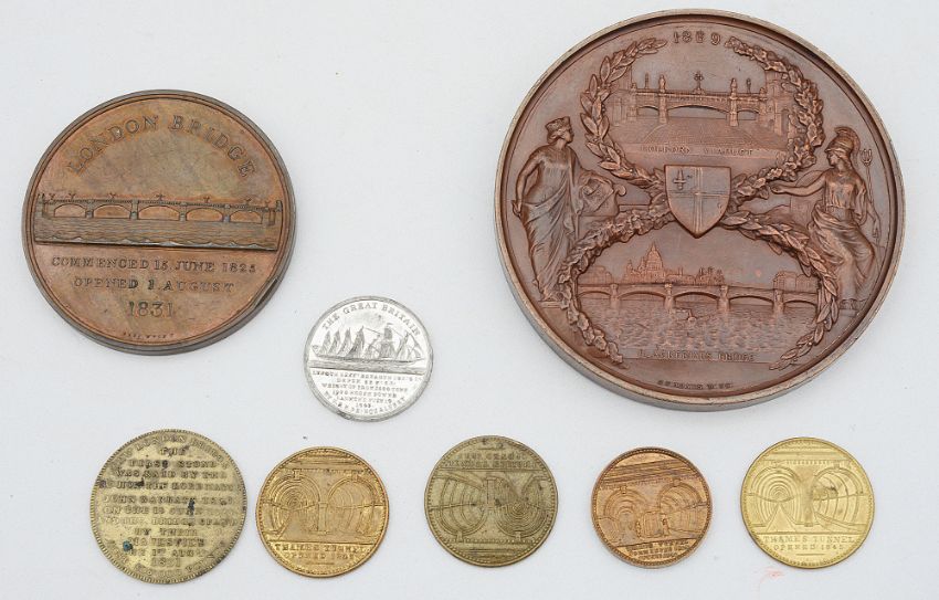 first Blackfriars Bridge and the Holborn Viaduct opened 1869 bronze medal by G G Adams for the Corporation of the City of London, crowned bust of Victoria left, rev. views of the bridge and viaduct, second London Bridge opened 1831, bronze medal by B Wyon, barehead bust of William IV right, rev. view of the bridge, issued by the Corporation of the City of London together with and 1831 London bridge token, four 1843 tokens relating to the opening of the Thames Tunnel (Brunel) and three others (Griffin) and 1843 Prince Albert silvered medal commemorating the SS The Great Britain., (8)