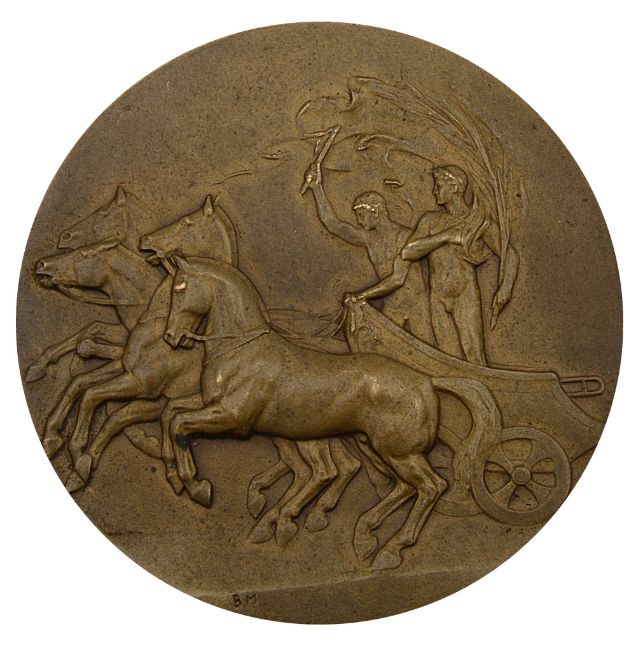 showing the winged figure of victory and a quadriga, stamped 'BRONZE' to the edge,