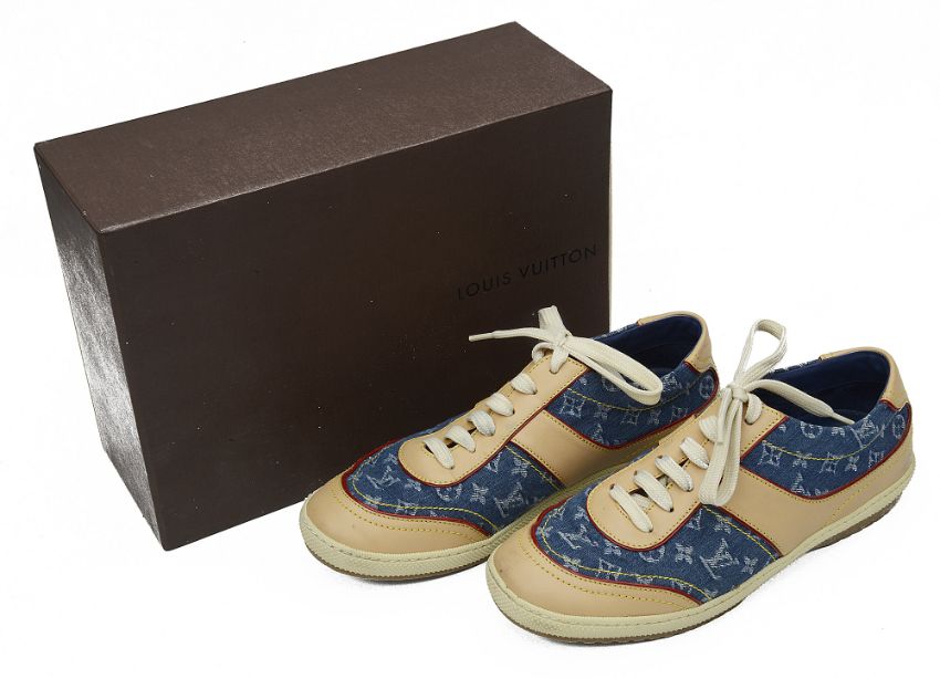 the two tone blue denim monogrammed and vachetta shoes with cream laces, cream trim and yellow stitching, size 37, in original box