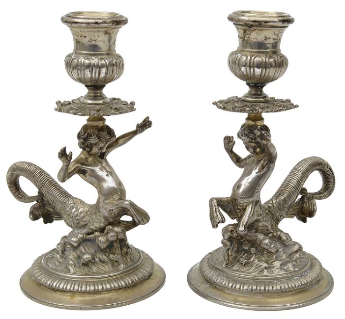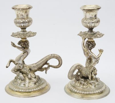 A pair of Italian silver cast candlesticks in the form of centurion sea gods (ichthyocentaurs)