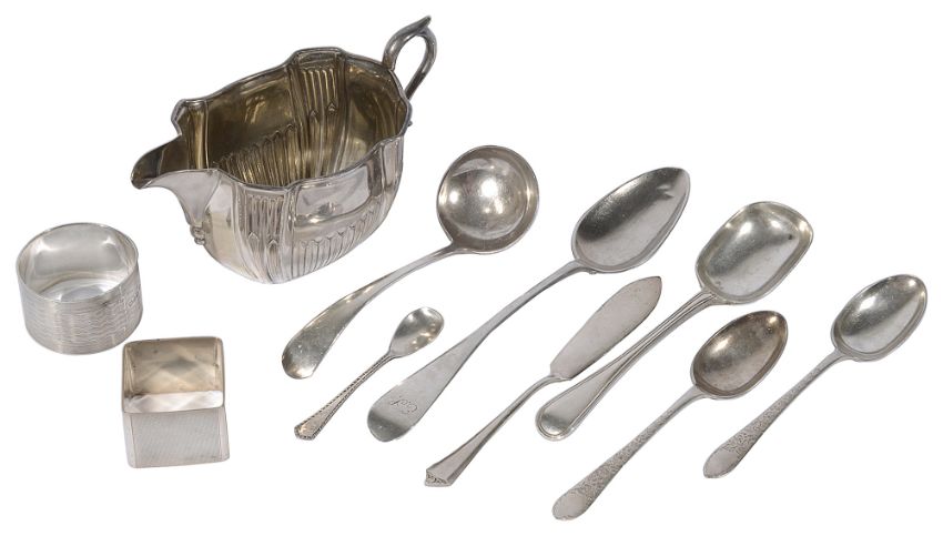 first Sheffield, 1903 by Harrison Brothers, of oblong half fluted design, interior gilt stamped RD 412382, together with an early 19th century century continental spoon, various marks, an Old English Thread pattern sugar spoon, London, 1908 by Holland Aldwinckle & Slater, a sauce ladle, a butter knife two cocktail forks with mother of pearl terminals, two engine turned napkin rings, initialled, (qty)