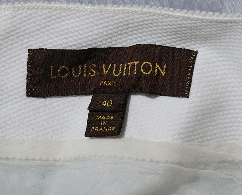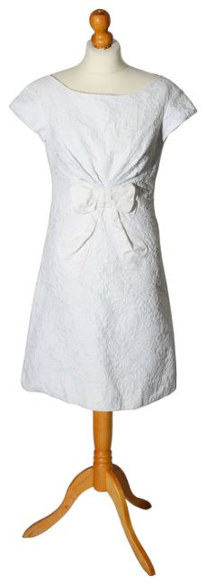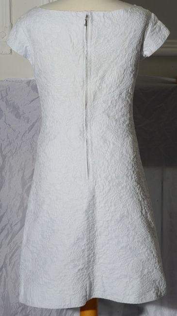 in a pale blue and white colourway with a boat neck, zip closure and hook and eye fastening to the top, fully lined in organza fabric. Size 40