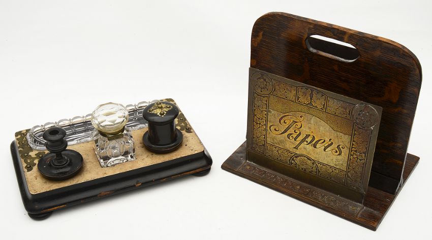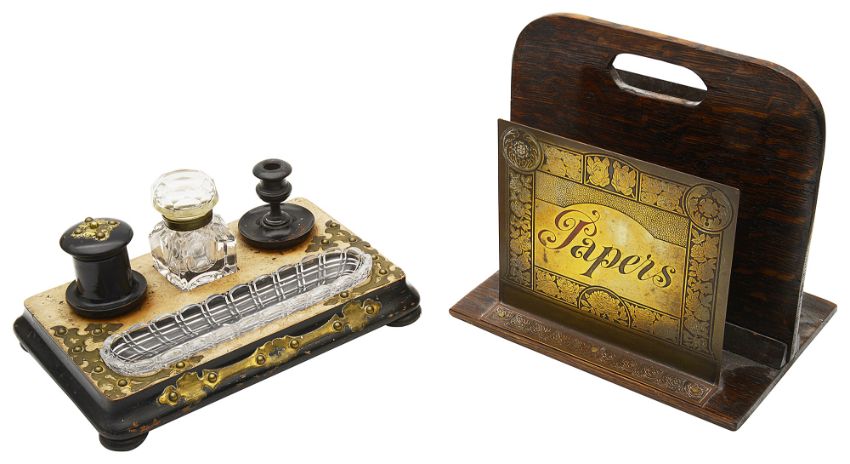 A Victorian ebonised inkstand and a twentieth century brass and oak paper rack