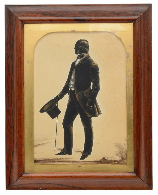 cut out full length silhouette portrait of a gentleman with a walking cane and holding a top hat, heightened in white and bronze, signed Frith, 1850, arched gilt mount, contemporary rosewood frame