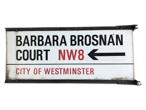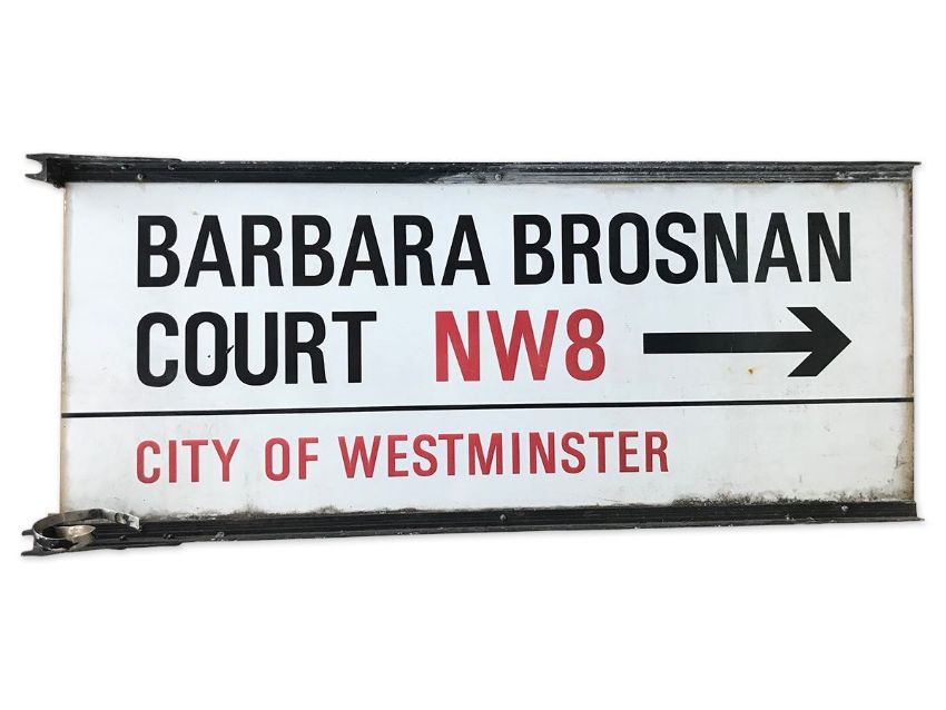 A double sided enamelled iron street sign on brackets for Barbara Brosnan Court NW8, City of Westminster