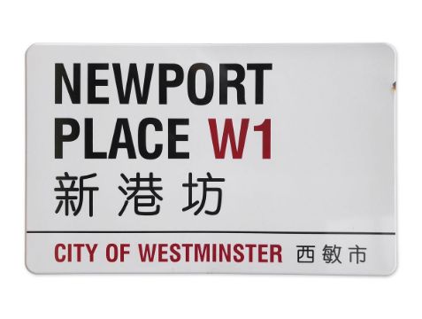 An enamelled iron street sign for Newport Place W1 Chinatown, City of Westminster