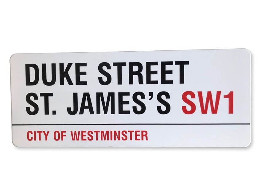 An enamelled iron street sign for Duke Street St. James's SW1, City of Westminster