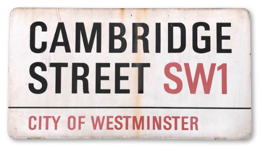 An enamelled iron street sign for Cambridge Street SW1, City of Westminster, with iconic black and red sans serif lettering first created by Sir Misha Black in 1967 which is unique to the Westminster signs and under copyright law, forbidden to be copied anywhere else in the world, sold together with a signed Certificate of Authenticity