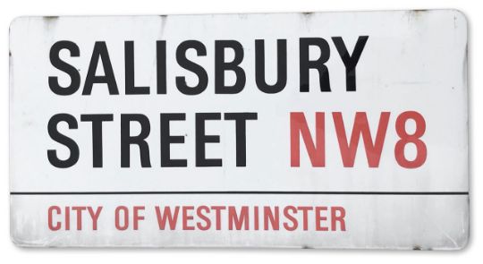 An enamelled iron street sign for Salisbury Street NW8, City of Westminster with iconic black and red sans serif lettering first created by Sir Misha Black in 1967 which is unique to the Westminster signs and under copyright law, forbidden to be copied anywhere else in the world, sold together with a signed Certificate of Authenticity