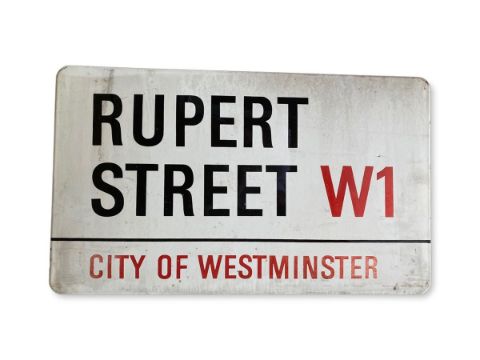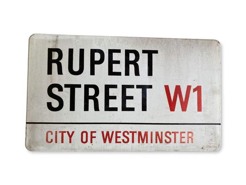 An enamelled iron street sign for Rupert Street W1, City of Westminster with iconic black and red sans serif lettering first created by Sir Misha Black in 1967 which is unique to the Westminster signs and under copyright law, forbidden to be copied anywhere else in the world, sold together with a signed Certificate of Authenticity